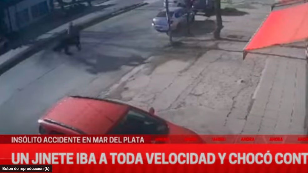 El incidente fue captado por una cámara de seguridad instalada en un comercio cercano, mostrando cómo el jinete, a gran velocidad, se acerca a la esquina y el caballo impacta contra el automóvil por detrás, provocando el choque.